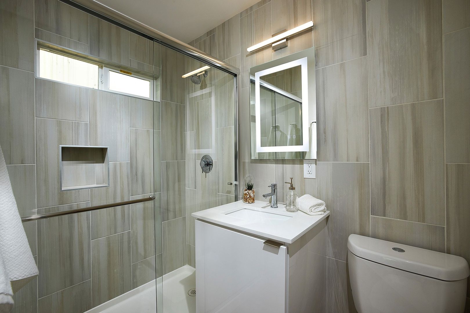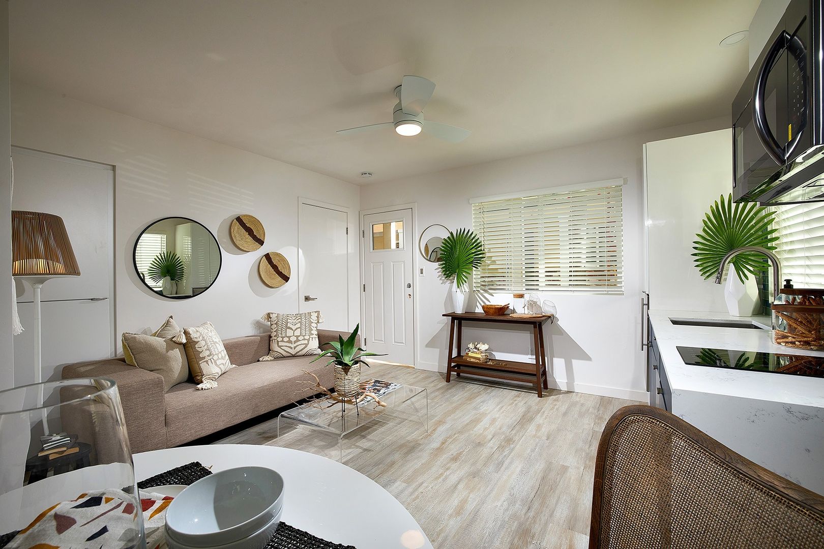 The Cove at PB is newly renovated and equipped with well-appointed interior features such as modern white and sapphire kitchen cabinetry, coastal-toned glass backsplash, white and smoky gray sleek quartz countertops, superb stainless steel appliances and fixtures, contemporary bathroom with luxury touches like an anti-fog bathroom mirror with dimmable lighting, and stylish vinyl flooring throughout.