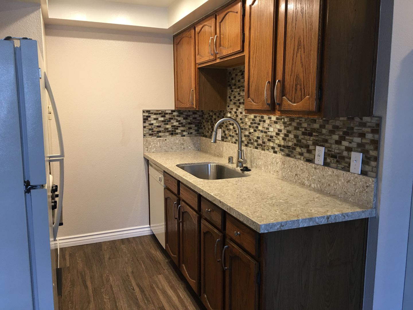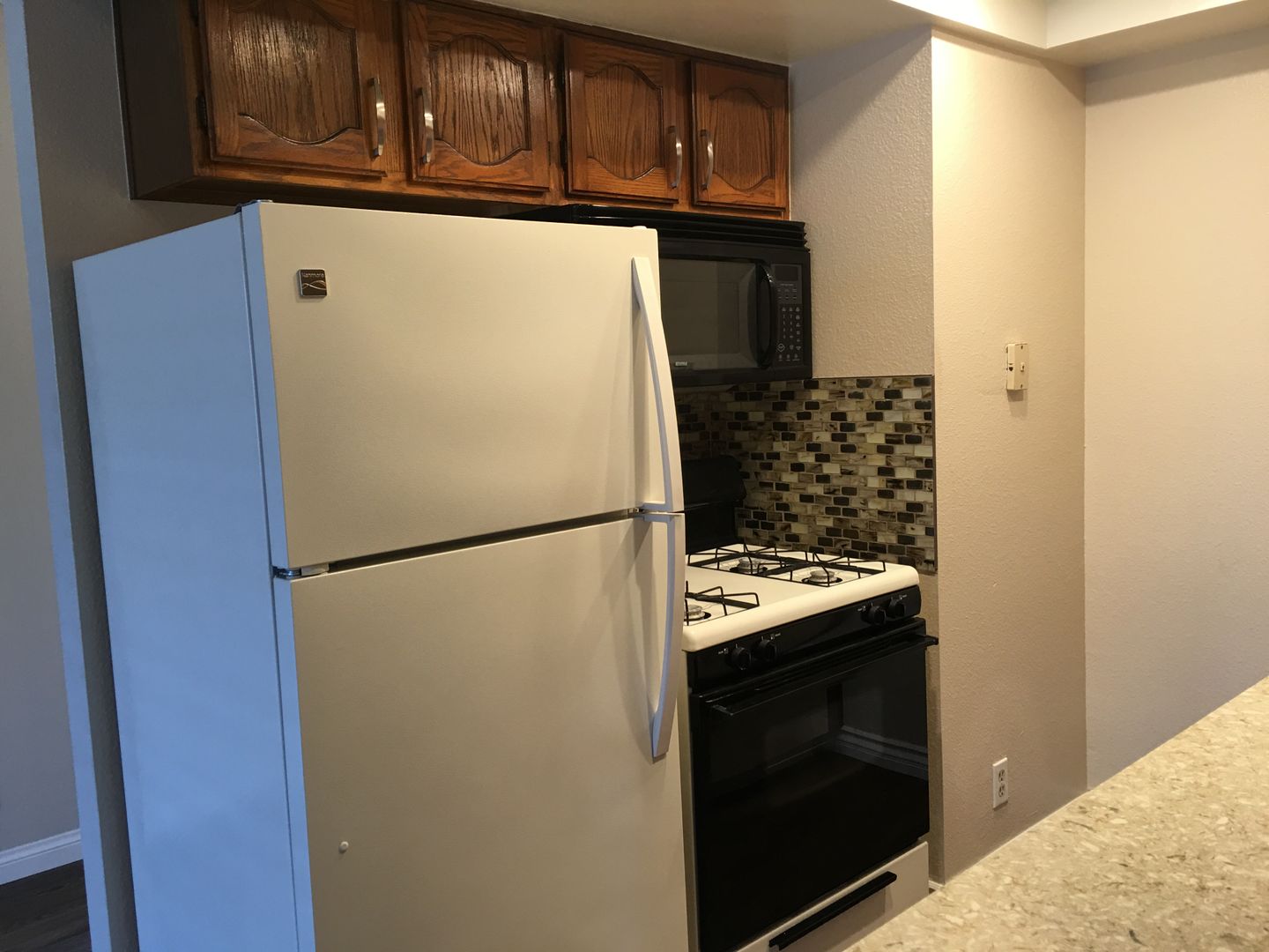 The kitchen has a dishwasher, gas stove, refrigerator, and microwave.